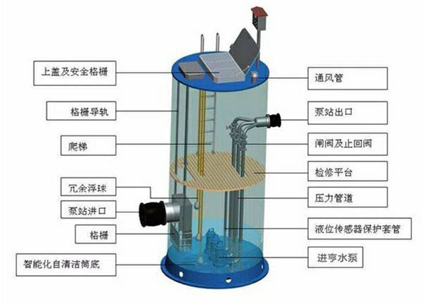 4、集成一體化。一體化預制泵站由水泵、潛污泵、粉碎柵欄、控制系統(tǒng)、遠程控制系統(tǒng)、自動清洗底座主要部件和泵站基本設備集成。縮小的身體蘊含強大的功能。